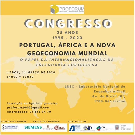 Para assinalar os 25 anos da PROFORUM Associação para o Desenvolvimento da Engenharia, irá ter lugar um Congresso no dia 11 de Março 2020, quarta-feira, das 14:30 às 19:00 no LNEC Laboratório Nacional de Engenharia Civil, “Portugal, África e a nova geoeconomia mundial – o papel da internacionalização da engenharia portuguesa”