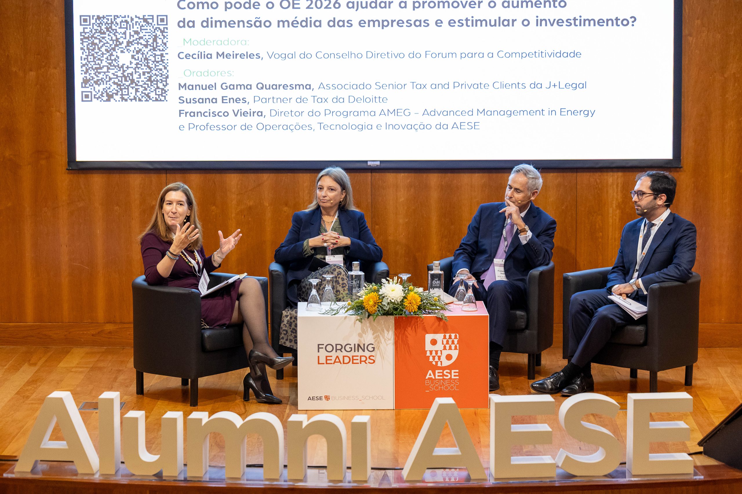 O segundo painel foi dedicado ao tema “Como pode o OE 2026 ajudar a promover o aumento da dimensão média das empresas e estimular o investimento?” e contou a moderação de Cecília Meireles (Vogal do Conselho Directivo do Forum para a Competitividade e Secretária Geral da ATIC) e com a participação de Manuel Gama Quaresma (Associado Senior Tax and Private Clients da J+Legal), Susana Enes (Partner de Tax da Deloitte) e Francisco Vieira (Director do Programa AMEG e Professor de Operações, Tecnologia e Inovação da AESE Business School) .